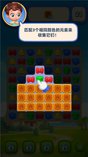1.移动画面中的方块,将三个相同图案的方块连成一线即可完成消除。