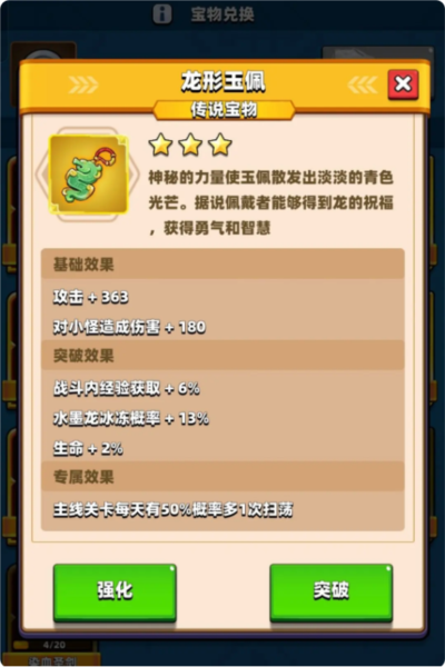 四星词条提供高额暴击率,配合双龙戒等加成,几乎可实现每次攻击暴击。龙女四十级与八十级词条分别增加暴击率与生命值,七星提供大量攻击力。龙女与孙悟空是唯二拥有宝物联动机制的英雄,装备龙形玉佩后,水墨龙有概率冰冻敌人,此冰冻效果受击后不会解除。