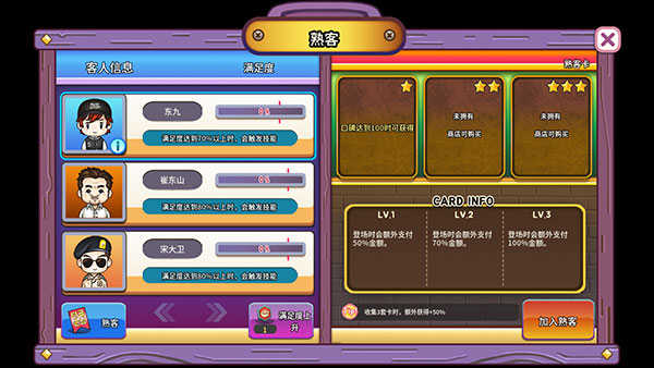 2、独特客户系统:每位老顾客都拥有特殊技能,通过建立并维护熟客档案,可以激活专属增益效果,为经营增添策略趣味。