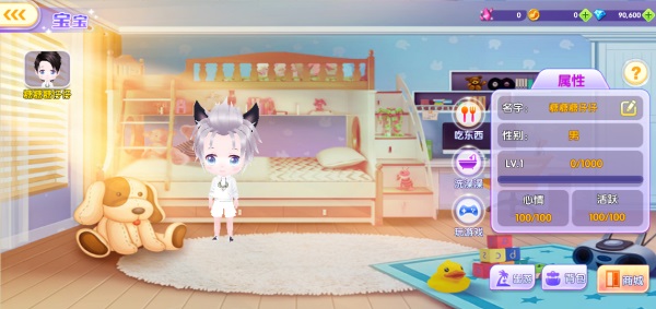 在室内时,可对宝宝进行喂食、游戏、洗澡等操作;喂食增加经验值,游戏提升心情值,洗澡恢复活力值。目前宝宝最高等级为5级,未来将开放更高等级及更多玩法。