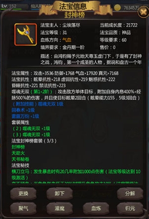 剩余钻石请谨慎使用,留待后续关键功能;获得法宝后即可开始挂机历练,掉落装备可优先穿戴,多余物品全部熔炼以积累资源,前期熔炼值主要用于打造当前等级的神魔套装副本紫装。