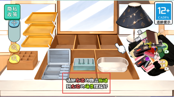 3、根据游戏指引,将右侧物品拖拽至左侧合适区域摆放整齐。