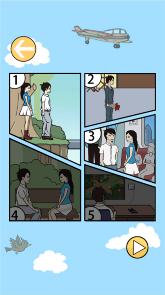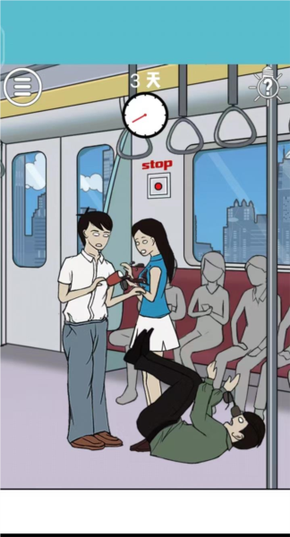 9、先点击绿衣男生手中的饮料,再点击他本人;接着将其拖到女生旁边,把饮料交给白衣男生;最后点击场景中的红色停止按钮,便能成功通关;