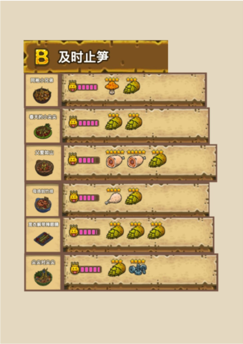 搭配食材制作料理是游戏的核心特色之一。玩家在研发时可以充分发挥想象力来尝试各种配方。若不习惯手动逐个搭配,也可通过投掷骰子的方式随机组合食材,以探索未知料理。游戏特别设计了配方组合算法,不同食材的搭配能产生千变万化的料理,因此同一道料理可能存在多种配方,但其中仅有一个为最优解。研发次数越多,所需消耗的金币与时间也会相应增加。