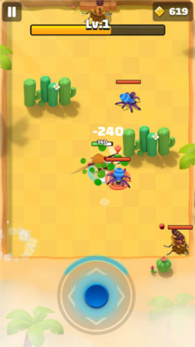 1. 游戏采用鲜亮的卡通风格,初看有些类似皇室战争的视觉感受,这一点或许正契合海外玩家的审美偏好。操作同样简洁:长按屏幕可唤出虚拟摇杆,向特定方向滑动即可控制角色移动;遇到敌人时,松开手指角色便会自动用弓箭攻击距离最近的目标。简单概括就是移动与攻击交替进行的战术。