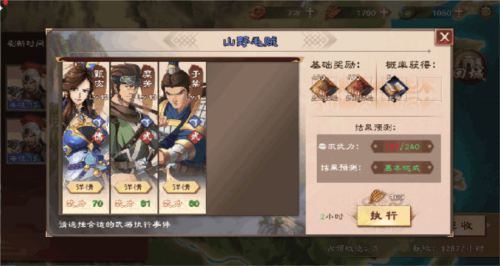 2、事件:派遣武将组合处理随机事件,事件对武将体力、武力或智力有不同要求;编队能力总值满足要求可获得基础奖励,并概率获得额外奖励;武将执行内政时仍可参与其他战斗。