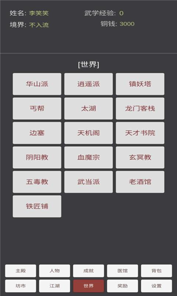 2、各类功法与技能皆可习得,前路充满未知;你需要不断提升自己的名声,逐步成长为受人敬仰的大侠。