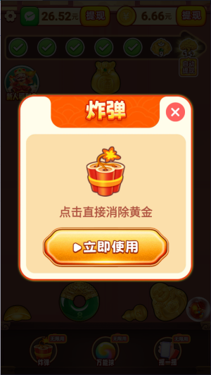 5、设有三种辅助道具:炸弹可消除指定黄金;