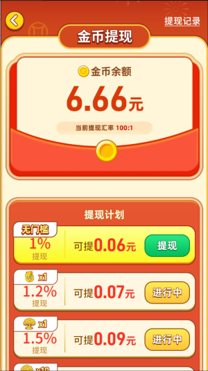 8、除了过关提现,积累的金币红包也可按比例直接提现。