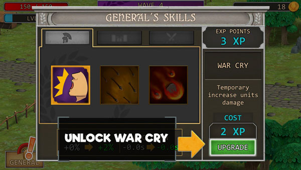 4、积累经验提升帝国等级,解锁技能点。技能包括增强士兵攻击、对城墙伤害加成或释放火球术等。其中战吼技能可全面提升部队攻击力,较为实用。