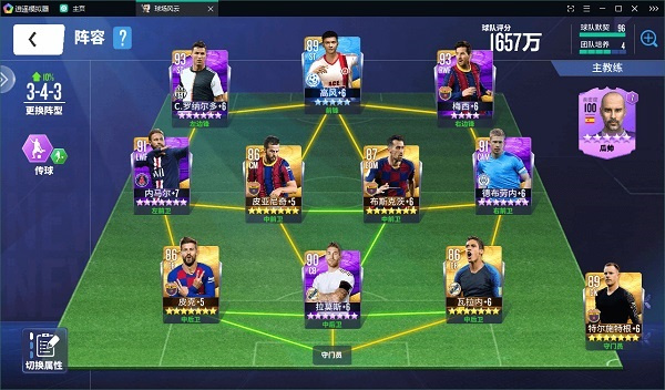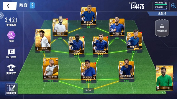 评分不足时以星级弥补,此阵容成型迅速且战力可观,包含多张85评分球员。