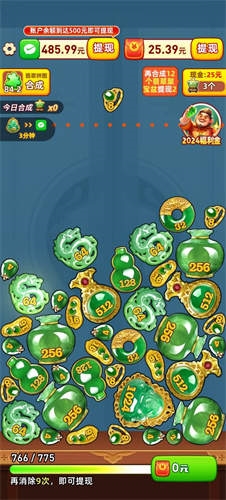 进入游戏后,你会看到各式珠宝从上方落下,直接移动它们就能完成合成,整个过程轻松又解压。通过不断合成掉落的玉器与翡翠,每次成功都能积累小额红包,而合成出稀有的翡翠聚宝盆更能获得额外提现奖励,合成得越频繁,收获的回报也越丰厚。