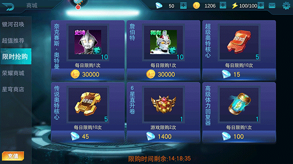 此板块商品均享有折扣,性价比突出。金币抢购可换取英雄碎片,甚至史诗碎片;钻石抢购则可获得六星直升券、体力恢复器、奥特核心等珍贵道具。