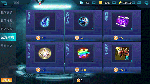 商城系统是消耗钻石获取道具的核心场所,包含银河召唤、超值推荐、限时抢购、荣耀商城四大板块。