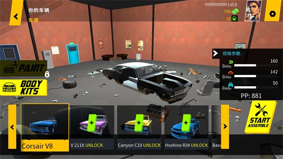 6、在主界面点击车库,可以继续组装其他车辆;每款车都有大量专属配件等待组合。