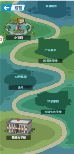 校园规划:左上角规划页面类似拼图,随等级提升逐步解锁新区域,补全完整画面;