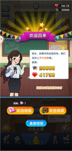 挂机收益:离线后自动累积资源,上线可直接领取,观看广告或使用钻石可加倍获取,校董等级决定单次挂机时长上限;