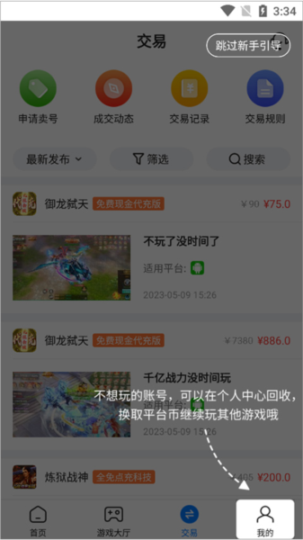 2、对于不再游玩的账号,用户可在个人中心进行回收,换取平台金币以体验其他游戏。