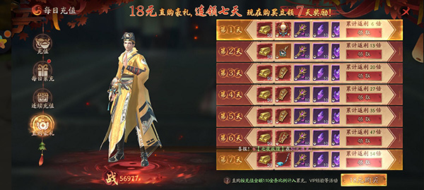 支付18元直购礼包,可连续七日稳定领取金锭、道具等奖励,有效助力战力提升,适合希望以较小投入获得成长的玩家。