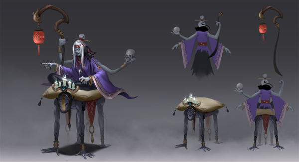 白发婆娑的老妪拄拐从暗室踱出,身下骑乘人面兽身的妖魔。她双眼覆着白翳,却仿佛能直视前方,嘴角缓缓扬起诡笑,低声呢喃:你身后跟着邪灵,要老身替你驱赶吗?