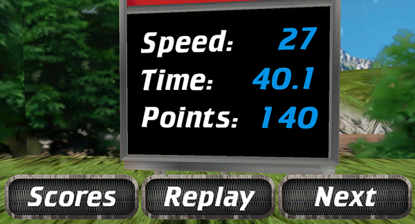 5、成功抵达终点即通过关卡,可查看速度与用时;不满意可点击replay重试,满意则点击next进入下一关。