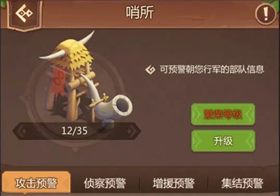 不想被突然袭击?尽快升级哨所。当领地遭受攻击、侦查、运输或援军抵达时,哨所会发出警报。哨所等级越高,每日可进行的侦查次数也越多。