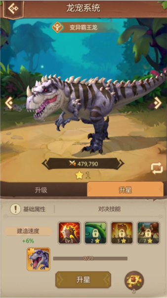 提升龙宠基础属性,解锁并强化军团技能与对决技能。升级消耗龙宠升级道具,主要从野蛮人部落、狩猎、角斗场、探索等途径获得;达到一定等级需进行突破,突破消耗突破精华,可通过击杀恐龙获取。等级上限随首领大屋等级提高而增加。