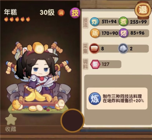 【若年糕制作的三道菜拥有至少一个相同技法,则全场炸类料理售价额外增加20%;例如制作炸蒸、炸煮、炸三道菜,因均有“炸”技法,即触发加成;若三道菜均为炸蒸或蒸煮,则加成提升至40%】