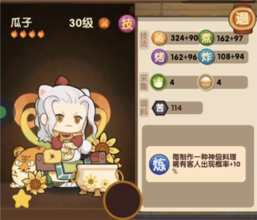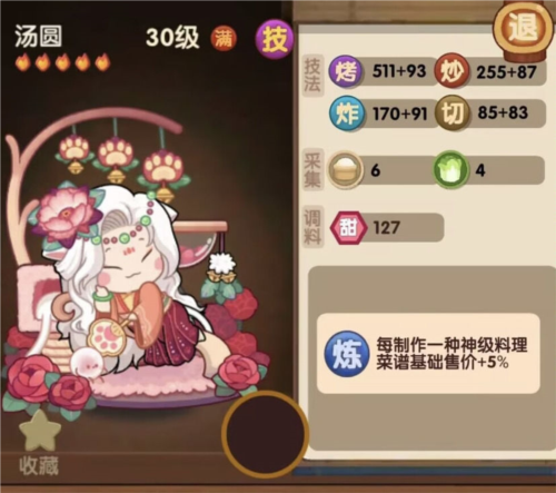 技能:烤类料理售价提升40%;
