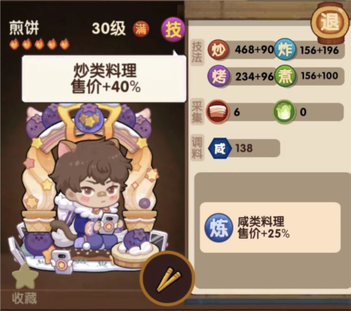 技能:炒类料理售价提升40%;