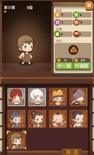 厨师们各怀绝技,不仅能采集烹饪,还会在过程中与你闲聊。通过升级与进化可以提升他们的能力,厨师进化至二阶可获得新技能,进化至三阶则可装备专属厨具,从而大幅提高烹饪技法与顾客满意度。