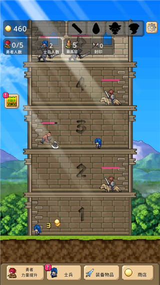 游戏的核心舞台是一座高耸的塔楼,每一层都设有独立的关卡与守卫勇者。玩家需要持续招募并组建部队,从底层开始向上进攻。通过击败每一层的敌人,可以解锁后续关卡并获得丰厚奖励;不断提升队伍整体实力,最终目标就是登上塔顶。