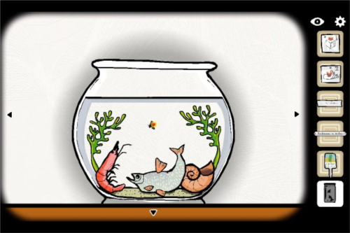 8、将虫子放入鱼缸,点击水草使虫子落入贝壳,贝壳内伸出手指将虫子点亮后推出,喂给鱼吃,鱼化作钥匙;