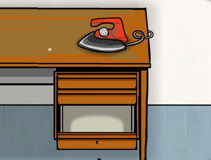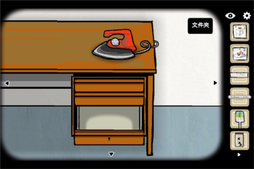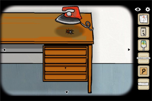 10、拨开女尸脸上头发,点击其嘴部爬出的甲虫并跟随,待甲虫爬上桌面后用熨斗压扁,获得钥匙;