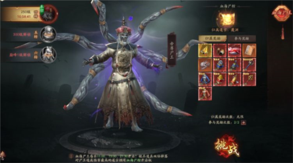 血海尸王属于跨服限时玩法,每日在三个时段开放:11:00、19:00与21:30。尸王被击败时,伤害排名前三的玩家必定获得归属奖励,第四至二十名中随机抽取两名获得;伤害第一名可取得150%的完美归属奖励,第二名获得120%,第三名获得100%。其余造成伤害的玩家可获得参与奖励,每日上限两次。道宗总伤害排名首位的宗门将开启血海尸棺,从中获取橙3星装备、灵鲲骨及套装石等;尸王等级越高,掉落奖励越优质。