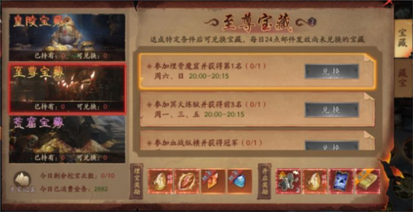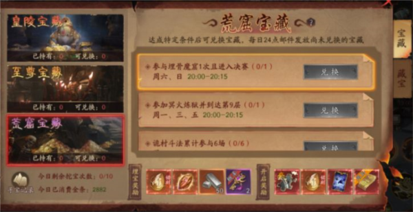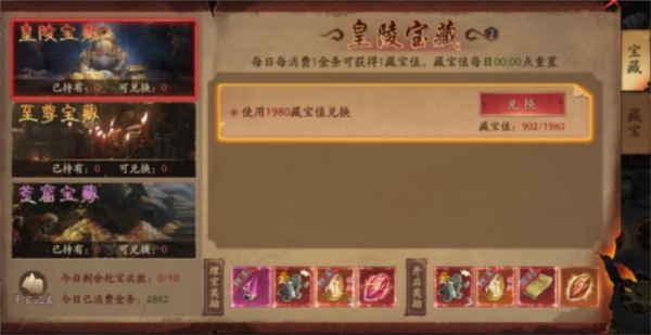 藏宝系统包含多种宝藏类型:皇陵宝藏通过消费金条积累藏宝值兑换;至尊宝藏与荒枯宝藏需达成特定条件方可兑换。