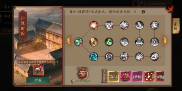 家园币积累至一定数量后家园自动升级,每升一级获得建造点,用于激活或升级建造项目。激活建造可解锁更多家具、家仆玩法及高品质宴席与派遣任务;激活特定天赋还能领取称号与时装。