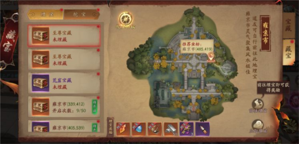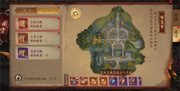 每日可进行十次挖宝操作,可挖掘自身所埋宝藏;地图界面显示剩余宝藏数量。皇陵宝藏需手动搜寻,至尊与荒枯宝藏可使用对应指南针定位;开启皇陵宝藏所得奖励最佳。