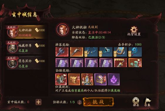 混沌鬼都每日19:45至23:00开放,由帮主、副帮主或成员投票开启。限时内击杀邪祟,速度越快星级越高,最高三星;邪祟会召唤保护小怪,需清理小怪后方可继续攻击。挑战成功后个人排行奖励自动发放,所有参与玩家可投掷骰子比拼点数,最高者获得额外装备奖励。