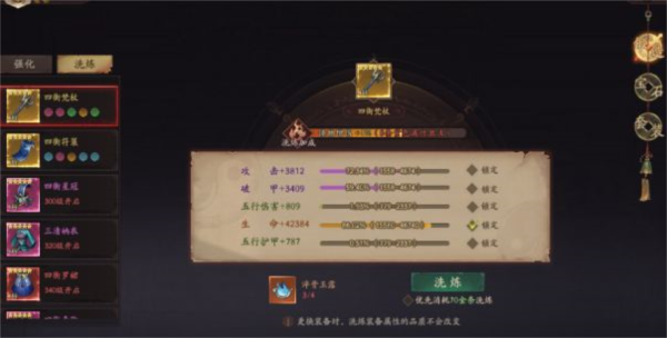 洗练功能消耗淬骨玉露提升装备星级属性的百分比数值,累计指定条数洗练品质后激活额外属性;洗练出橙色或红色属性时建议锁定后再继续洗练。