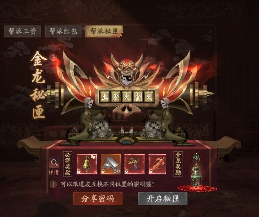 帮派密匣每日可免费领取一次,品质分蓝、紫、橙、红四档,品质越高奖励越好;可请求帮派成员帮助刷新为红色密匣。密匣密码由系统随机分配一位数,可求助帮派成员获取其他位密码。