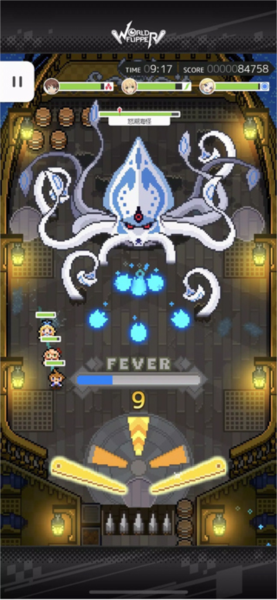 战斗以弹射为核心,点击屏幕可使角色冲刺并改变飞行路径。角色碰撞敌人后会自动攻击,运动轨迹遵循反射原理。角色坠落底部尖刺区域会受到伤害并重置连击数。角色生命值归零后会变为棺材,对其攻击指定次数即可复活。多人模式下可协助复活队友。战斗中系统会自动锁定最近或可破坏的弱点目标。通过连续攻击积攒“Fever槽”,进入Fever状态后可触发地图中的增益机关。