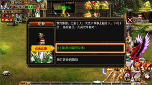 3、跟随初始剧情对话,点击选项开启三国征程。