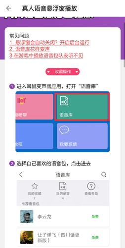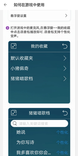 先在语音库收藏所需语音包,于设置中开启悬浮窗功能;打开游戏麦克风,在悬浮窗的“我的收藏”里点击语音包播放即可,语音包也支持个性化变声调整。