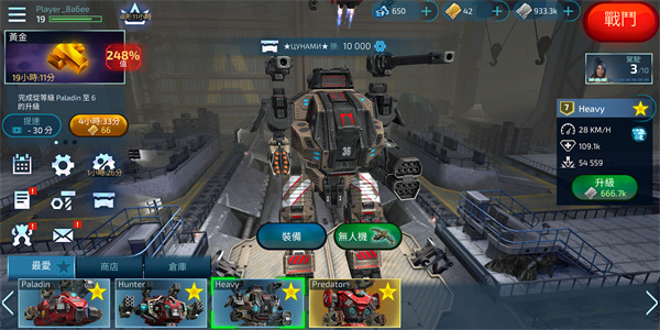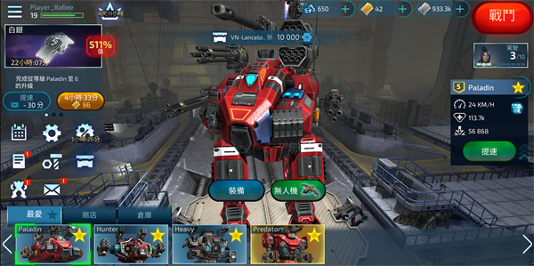 2、完成设置后,点击开始战斗,从机库中选择本次出战的机甲;机甲可通过游戏内获得的银币与金币进行升级或解锁。