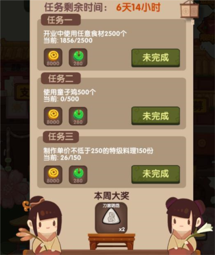 厨神大赛:每周参与,合理搭配菜谱获取奖励即可。