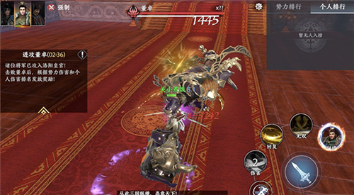第三关洛阳皇宫,需挑战BOSS董卓,根据势力伤害与个人伤害排名发放奖励。