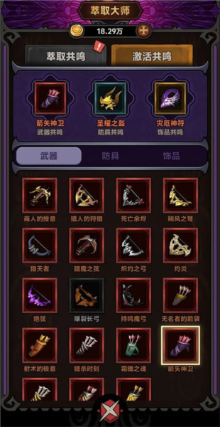 2、装备搭配:核心装备为“狂热套”套装、武器“商人的授意”、箭袋“箭矢神卫”或“嗜血箭袋”,属性稍次的“箭术的极意”也可作为备选;属性好的直接佩戴,另一件进行萃取。
