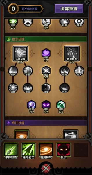 4、技能搭配:物理连弩作为核心输出技能必须点满;分裂冰箭用于减速敌人,可配合相关增伤被动;若宠物已提供减速效果,则可选用“分裂积蓄”来加速能量回复;物理复仇与蓄势待发也是常用选择;其余技能可根据实际战斗需求灵活配置。