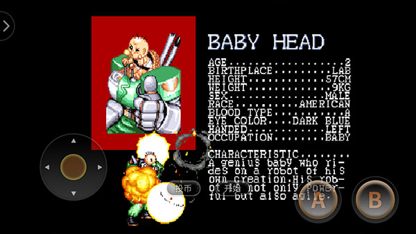 婴儿本身不具备攻击力,但其操控的高智能机器力量巨大,因此攻击力很高。由于婴儿是左撇子,出拳速度较慢且距离短,腿脚攻击范围也有限,适合近身作战。设计上取消了倒空翻招式,加入了符合婴儿特性的抓人大坐绝技,综合能力在四人中相对较弱。